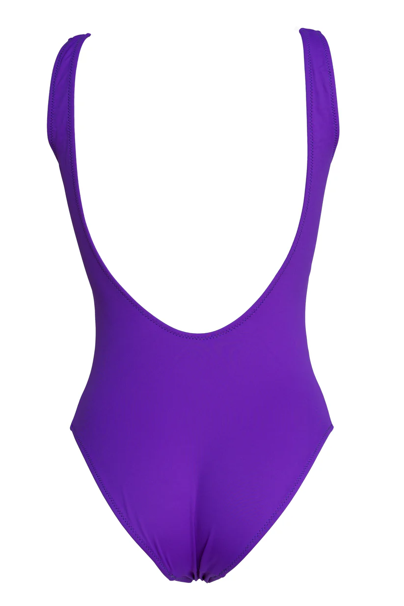 Bañador violeta de una pieza, disponible en corte normal.