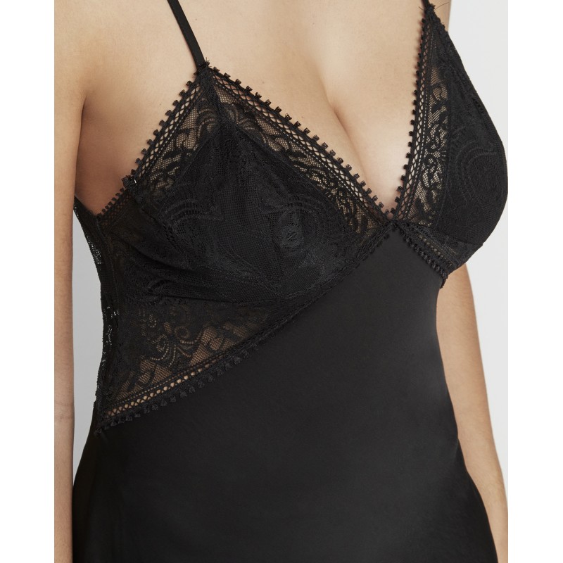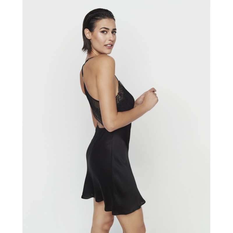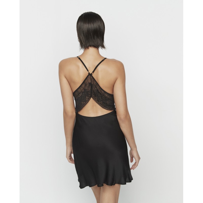 Camisón lencero corto con tirantes ajustables. La combinación de encaje delicado y transparencias sutiles de esta prenda transmiten una imagen de sofisticación y glamour irresistibles. Su estética impactante es un homenaje a las veladas donde la elegancia y la sensualidad se vuelven protagonistas. Esta pieza pertenece a la colección Aurum, creada en colaboración con Pilar Rubio para conmemorar nuestro 50 aniversario.