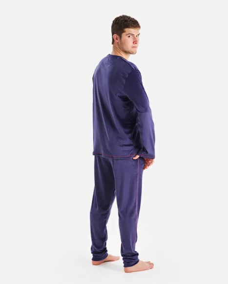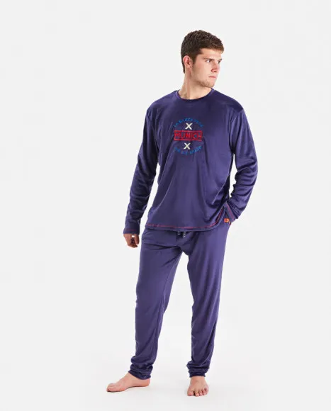 Conjunto de terciopelo de pijama para hombre de dos piezas, confeccionado en un suave y cálido tejido aterciopelado de color azul oscuro.