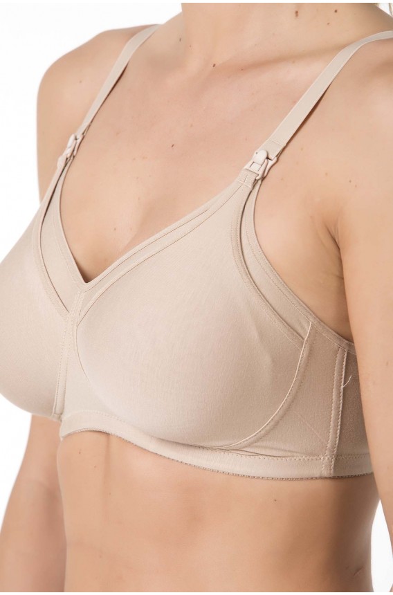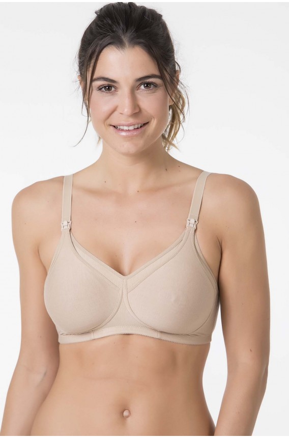 Sujetador de lactancia de tejido moldeado. Especialmente desarrollado para la lactancia materna. Sujetador confort con doble tejido prehormado de algodón transpirable, sin aros. Apertura delantera con clip en el tirante para facilitar la lactancia. De color piel.